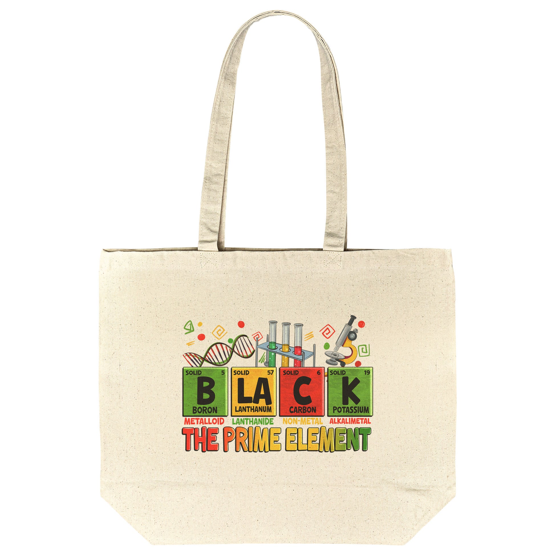 - Front Graphic: Featuring a vibrant and educational design, this tote bag highlights the elements Boron, Lanthanum, Carbon, and Potassium, spelling out "BLACK" with a clever twist. Each element is represented with its respective properties (Solid, Metalloid, Lanthanide, Non-Metal, and Alkali Metal) and illustrated with colorful laboratory equipment, a DNA strand, and scientific motifs, emphasizing the message "THE PRIME ELEMENT."